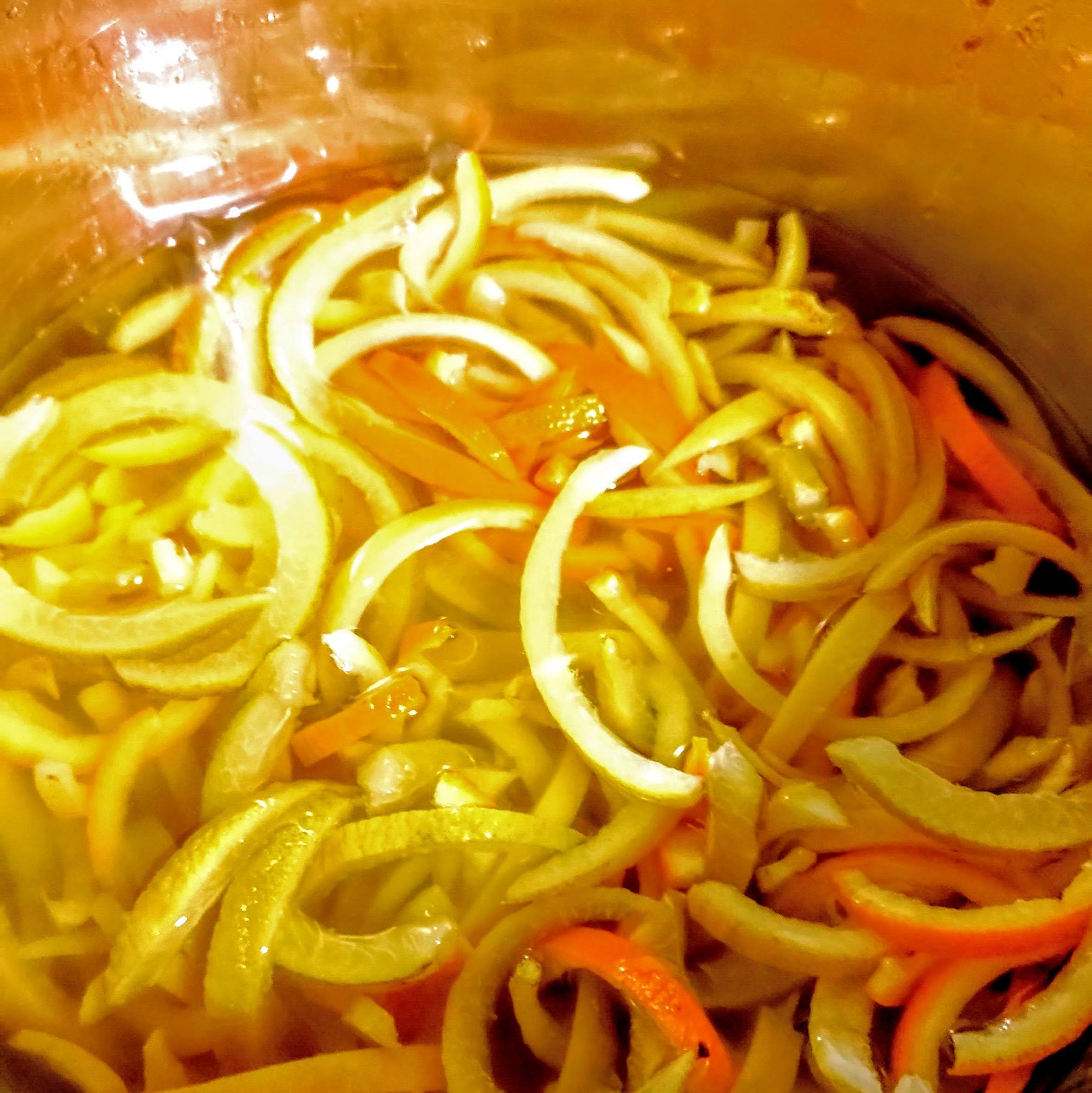 3. Po trzykrotnym blanszowaniu skórek, zrób syrop cukrowy, podgrzewając cukier i wodę w rondlu, aż cukier całkowicie się rozpuści, a mieszanka zacznie wrzeć. Dodaj skórki i doprowadź do delikatnego wrzenia, a następnie zmniejsz ogień, aby zmniejszyć ogień do wrzenia. Gotuj na wolnym ogniu aż skórki będą miękkie i słodkie, mieszając, aby się nie przypaliły. Gotowałam je kilka dni po 2-3 godziny, bo bardzo chciałam uzyskać efekt przezroczystości, dodając cukru i wody. Całości była bardzo, bardzo gęsta.